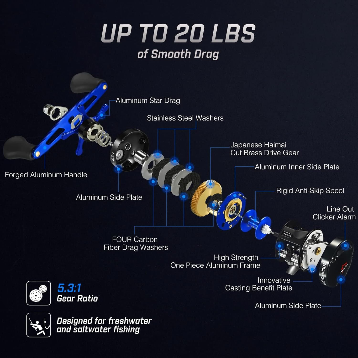 Piscifun Chaos XS Baitcasting Fishing Reel, Reinforced Metal Body Round Baitcaster Reel, Smooth Powerful Saltwater Inshore Surf Trolling Reel, Conventional Reel for Catfish, Musky, Bass, Pike